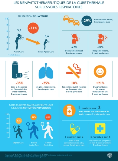Aussi, on note de bons résultats quant aux bienfaits ressentis sur les voies respiratoires après une cure thermale; une toux qui diminue de 31%, 27% d'écoulement nasal en moins ou encore un arrêt définitif de la cigarette pour 18% des 843 curistes ayant répondu dans les 3 mois suivants la cure thermale.